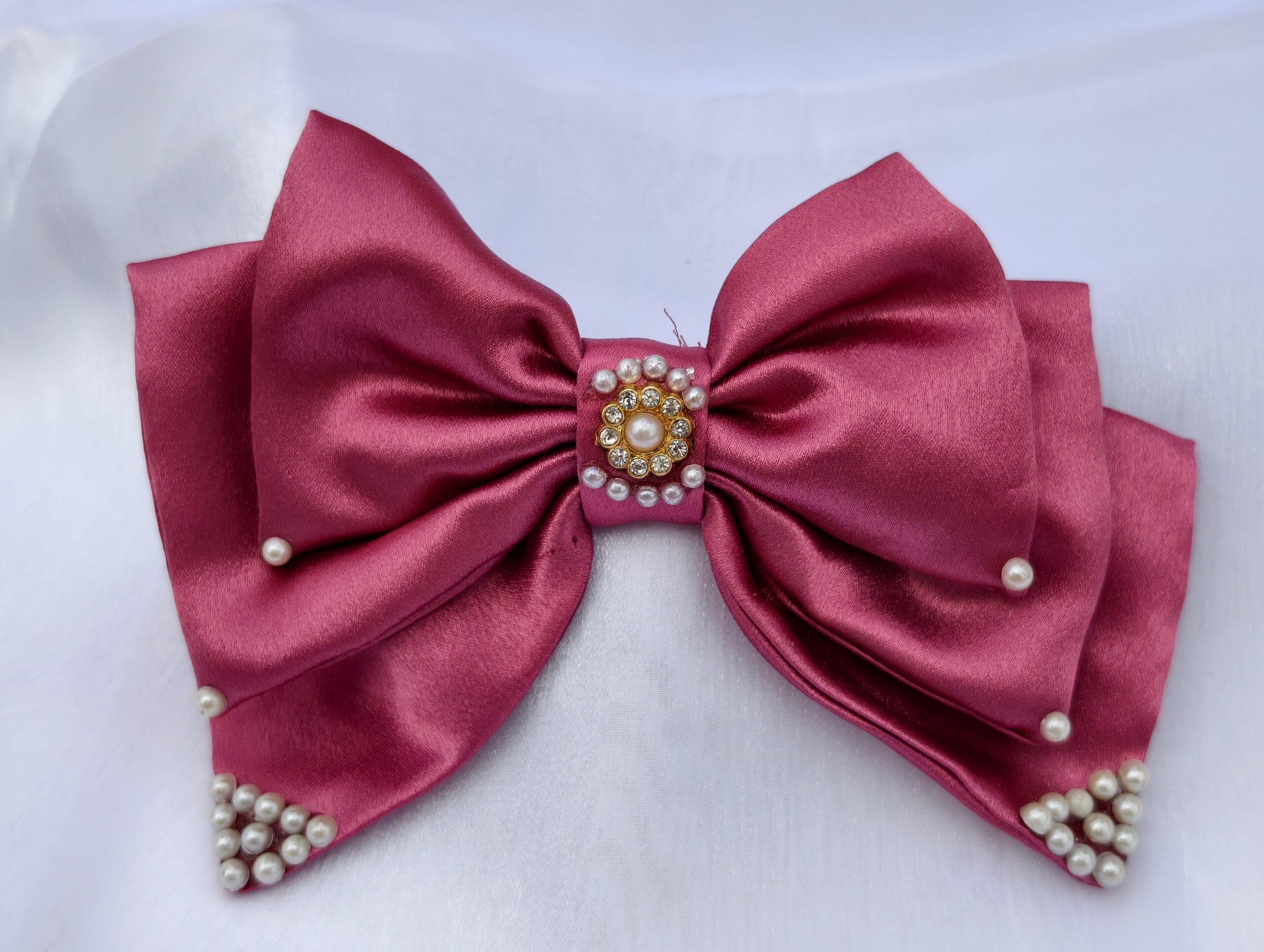 Add a royal touch to your hairstyle with this handcrafted satin bow hair clip in a stunning wine pink shade. Made from premium German satin fabric, this elegant bow features intricate golden bead embellishments and a braided golden center wrap, making it perfect for weddings, parties, festive wear, and traditional outfits.